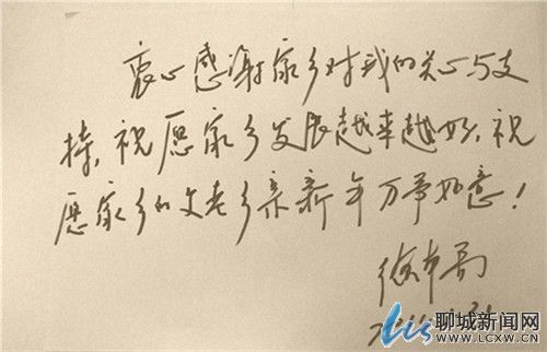 “祝家乡的父老乡亲身体健康、万事如意。用咱们山东的习俗,给咱老乡鞠三个躬吧!”在虚拟演播厅内,真性情的徐本禹现场对着镜头鞠了三个躬。徐本禹还欣然为聊城日报、聊城晚报、聊城新闻网题字:“衷心感谢家乡对我的关心与支持,祝愿家乡发展越来越快,祝愿家乡的父老乡亲新年万事如意!”表达了自己对家乡人民的祝福,对家乡发展的期待。 记者 赵宏磊